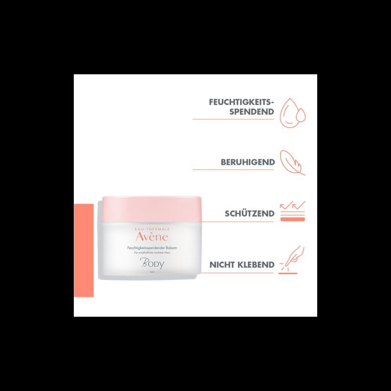Dieser Körperbalsam spendet der Haut langanhaltend Feuchtigkeit und macht sie wieder geschmeidig. Die cremige Textur und der wohltuende Duft umhüllen die Haut und schenken ihr Wohlbefinden. Der Balsam ist mit einem beruhigenden Komplex aus drei pflanzlichen Ölen angereichert und daher für trockene, empfindliche Haut geeignet. Die Haut fühlt sich bis zu 24 Stunden* geschmeidig und mit Feuchtigkeit versorgt an.